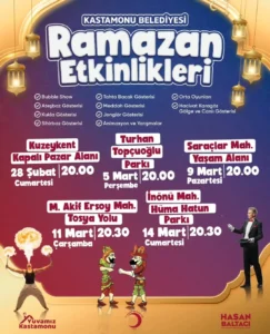 Kastamonu Belediyesi Ramazan etkinlikleri 28 Şubat’ta başlıyor. Kuzeykent, Topçuoğlu, Saraçlar, Mehmet Akif ve İnönü mahallelerinde Bubble Show, Hacivat Karagöz, meddah, kukla, sihirbaz ve daha birçok gösteri vatandaşlarla buluşacak.